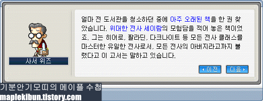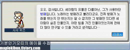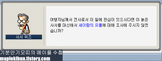 대화를 마치면 사서 위즈에게 퀘스트 아이템인 <세이람의 모험>을 받게 됩니다.