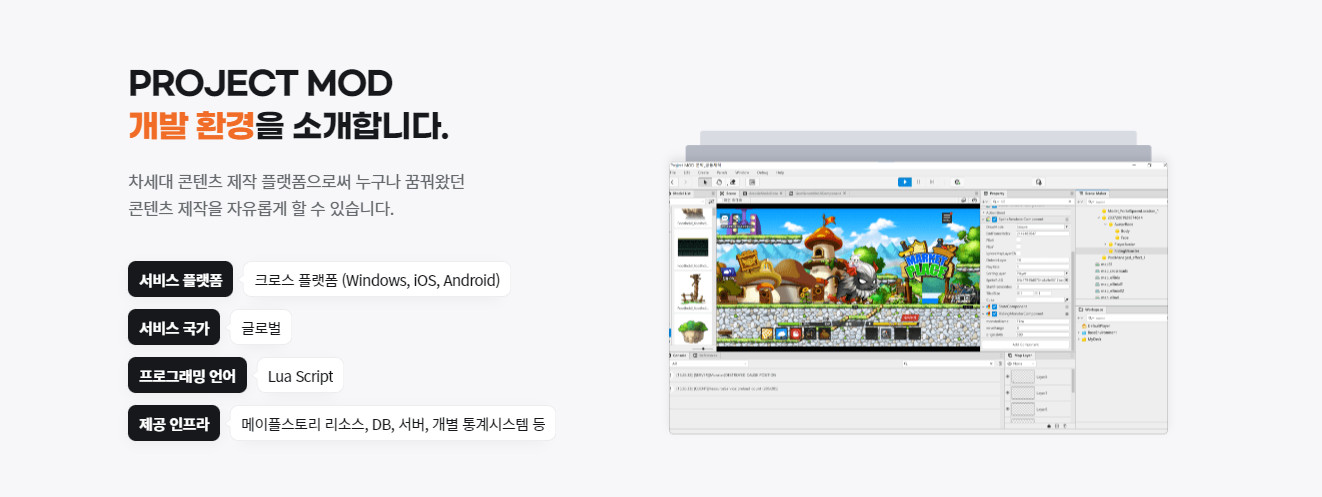유저가 자신만의 게임을 만들 수 있는 개발 환경에 대해서는 프로 모드와 이지 모드가 있으며