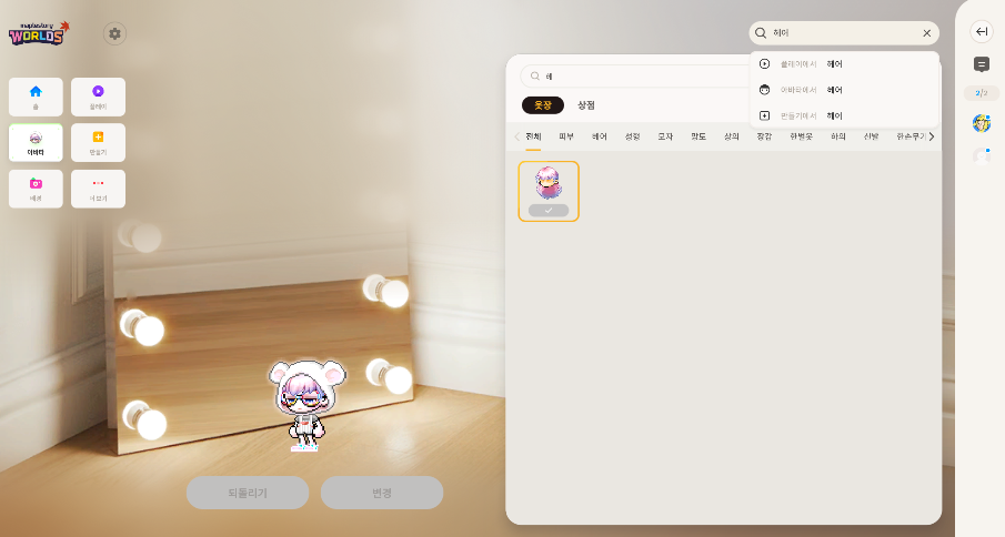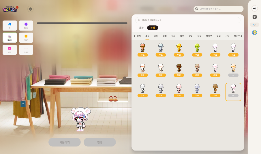 메이플스토리 월드에서 옷장 메뉴를 실행한 모습입니다.